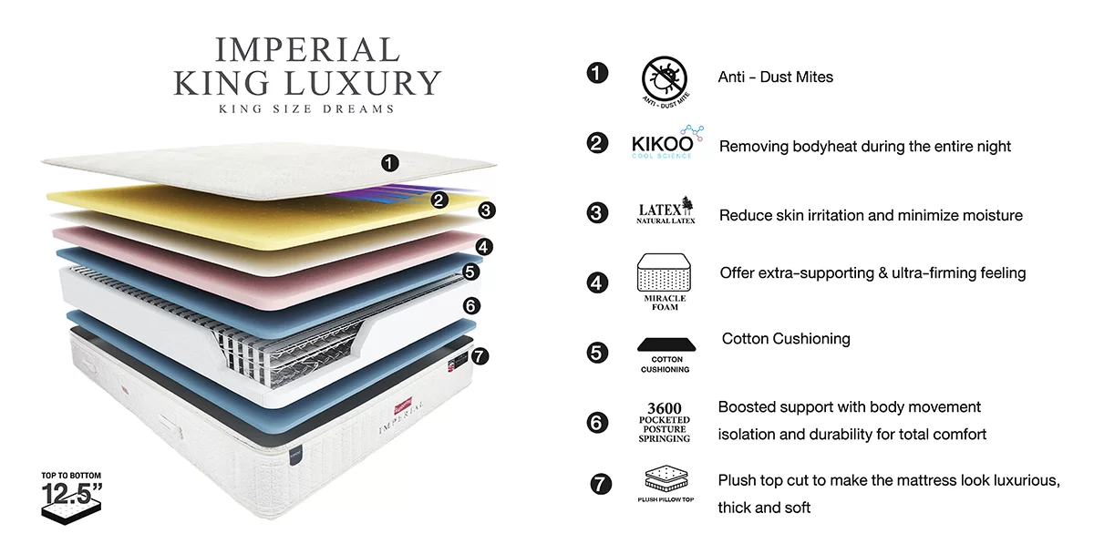 Imperial King Luxury reflects the luxury and value of sleep for you. Adding softness and comfort with a quality, imported velvet fabric from Belgium, and the sewing design providing the highest value for your bedroom. Kikoo's innovative technology, keeps you comfortably cool, for 12+ hours. Kikoo's technology, a naturally sustainable band solution, helps excess heat flow away and absorbs body heat, while you sleep with good heat transfer properties from Lambswool fibre, helping maintain a balanced body temperature and feel fresh throughout sleep."The Pocketed Spring System 3600 coil count" boosted support with body movement isolation and durability for total comfort. Create a unique fusion, provides proper support levels required for each body zone with the premium quality natural latex, you will feel comfort and relaxation.