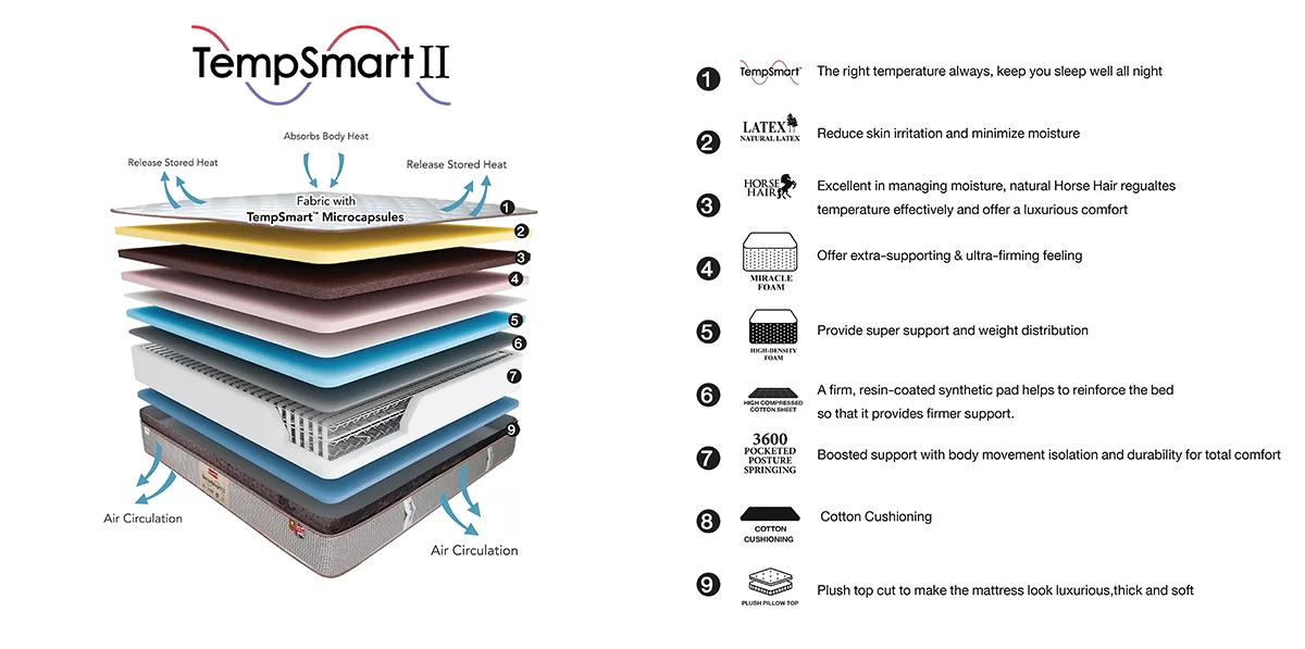 The TempSmart II mattress is an innovation developed from the NASA astronaut suit to regulate body temperature by containing a micro-capsule with good heat transfer properties from Horse Hair fabric and Lambswool fibre, helping maintain a balanced body temperature and feel fresh throughout sleep. Complemented by the exclusive Spacer Breathing Layer technology, the TempSmart II allows the air to circulate which making all your sleep the perfect time of relaxation.
