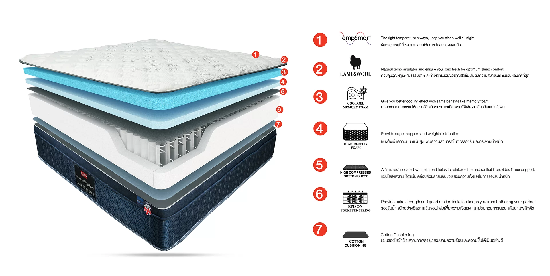 ที่นอนรุ่นพิเศษ "TempSmart Windsor" รูปลักษณ์ทันสมัย ผ้ายืด TempSmart เอกลักษณ์เฉพาะของสลัมเบอร์แลนด์ช่วยควบคุมอุณหภูมิของที่นอนให้สม่ำเสมอตลอดคืน และช่วยในเรื่องของการถ่ายเทความชื้นได้ดี คุณสมบัติพิเศษที่พัฒนามาจากชุดนักบินอวกาศที่ช่วยปรับอุณภูมิร่างกาย ที่นอนได้ถูกออกแบบด้วยระบบที่รองรับน้ำหนักอย่างอิสระให้ความรู้สึกนุ่มสบาย ไม่รบกวนถึงคนที่นอนข้างๆ เวลาขยับตัว พร้อมชั้นโฟมชนิดนุ่มพิเศษเพื่อการเคลื่อนไหวของคุณยกระดับคุณภาพการนอน สัมผัสสบายตลอดคืน